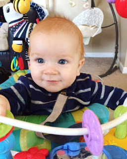 You are already six month old!!!! How did this happen sooooo quickly?! You are such a happy baby, we are so very blessed! I am guessing you are around 18 lbs. ....it seems your growth spurt has slowed down now that you are mobile and on the go with rolling, sitting with assistance and playing all the time! You wear 9 month clothes and size 3 diaper. You haven't cut any teeth yet, your starting to get interested in food but you still hates the sippy cup!